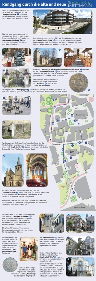 Die Bürger- und Heimatvereinigung "Aule Mettmanner" haben einen interessanten Rundweg durch die Innenstadt Mettmanns entwickelt, der einen vorbei an Denkmälern und Sehenswürdigkeiten führt. Gehzeit ca. 30 Minuten.